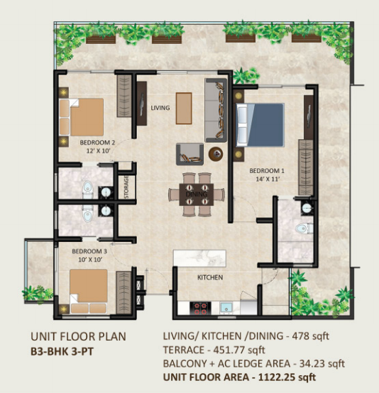 | B3-BHK 3-PT | Terrace Garden | 451.77 sqft |